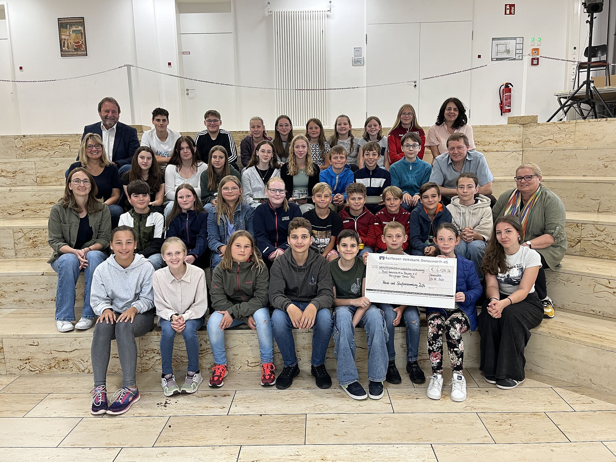 Besonders fleißig waren die Schülerinnen und Schüler der Realschule Heilig Kreuz aus Donauwörth mit über 6.000 € und des Gymnasiums Donauwörth mit knapp 5.000 €. Die Bilder zeigen die erfolgreichsten Sammlerinnen und Sammler mit den zuständigen Lehrkräften.