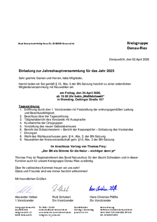 - Einladung zur Jahreshauptversammlung unserer Kreisgruppe am Freitag, 24.April 2026, ab 19 Uhr beim Wallfahrtswirt in Wemding